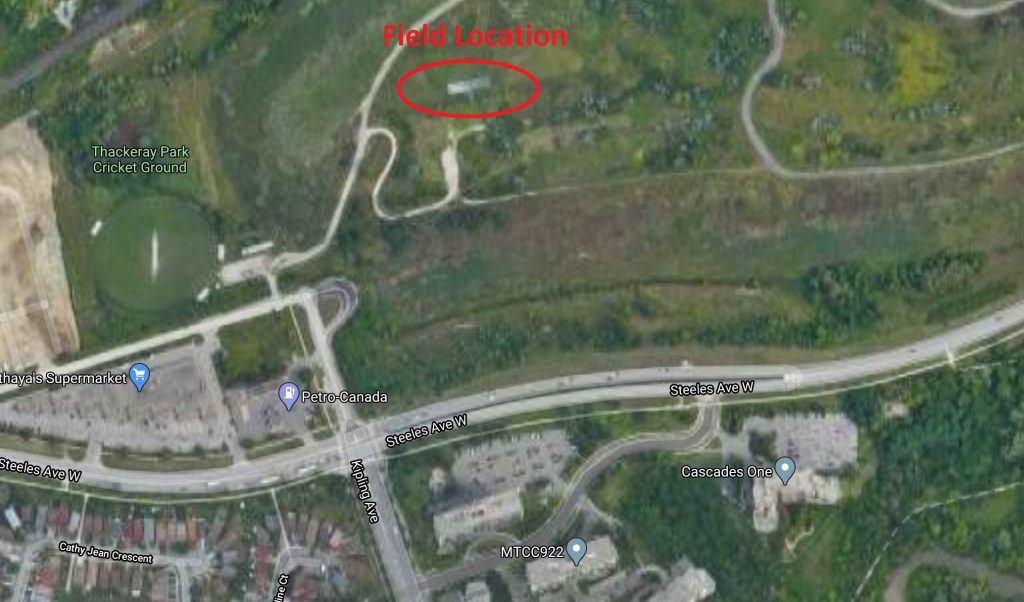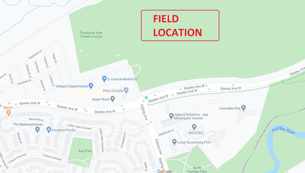 Our main field is located off Kipling Ave just north of Steeles. To get there drive North on the Hwy 400 and exit at Steeles Ave. Drive West for 5km and turn North on Kipling. Then go past the bus turnaround and through the gate ahead on the left to enter Thackery Park. Keep right and follow the gravel road to the right. At the top of the hill, go through the second gate on the right and follow the road to the field parking lot.